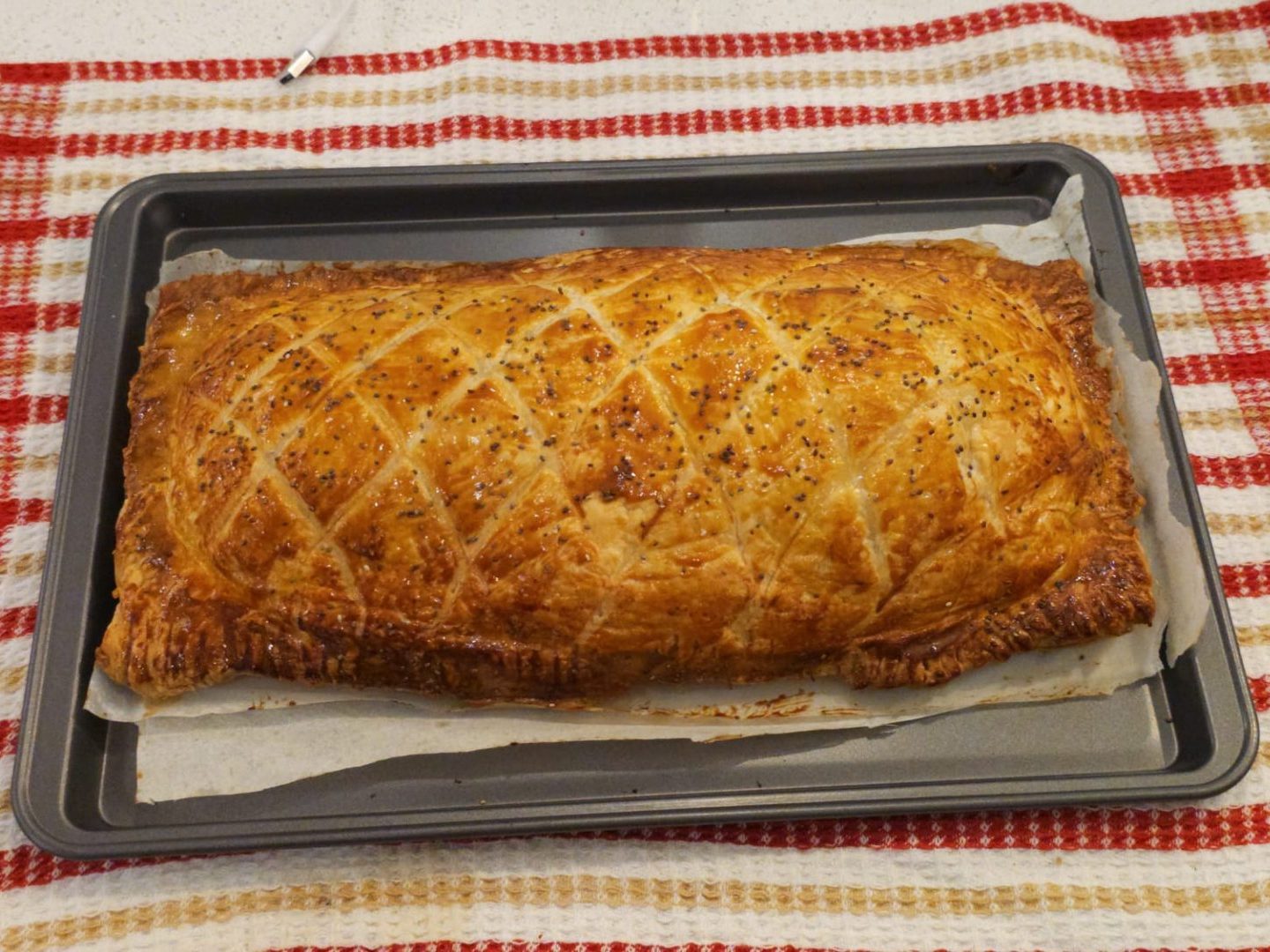 • Retirez la pellicule plastique et déposez le bœuf Wellington sur la plaque, le joint de pâte vers le bas.